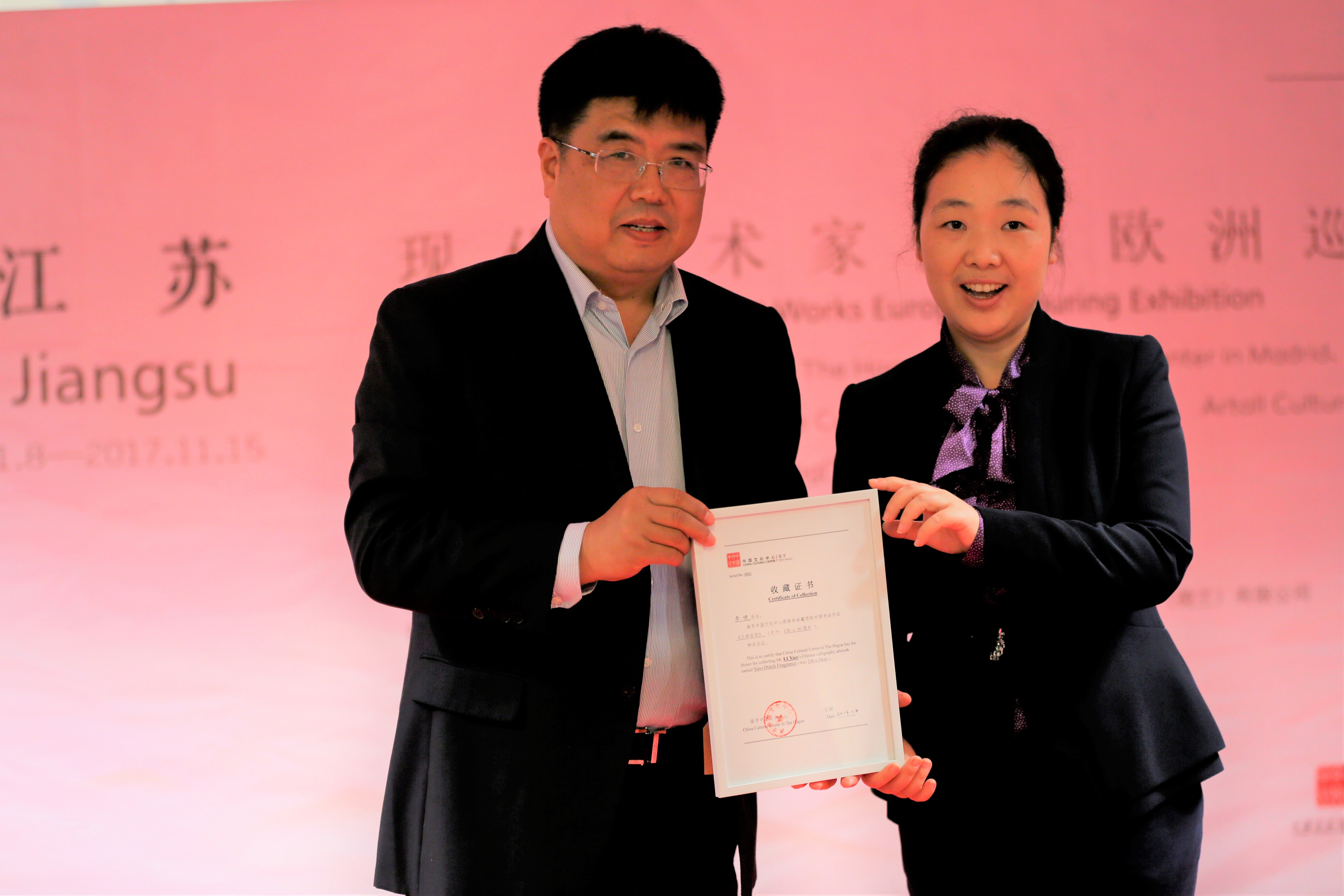 開(kāi)幕儀式上,江蘇省書法院院長(zhǎng)李嘯現(xiàn)場(chǎng)揮毫創(chuàng)作了《蘭荷芬芳》,并將該作品贈(zèng)送給海牙中國(guó)文化中心。海牙中國(guó)文化中心主任孫蓓代表海牙中國(guó)文化中心接受了捐贈(zèng),并向李嘯院長(zhǎng)頒發(fā)了《收藏證書》。