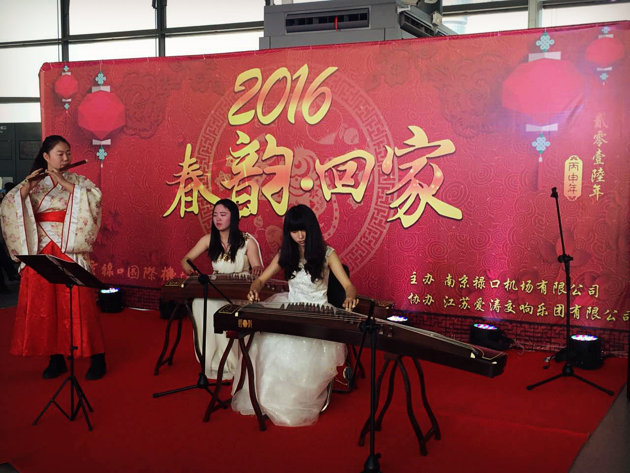 由南京祿口機(jī)場(chǎng)有限公司主辦,江蘇愛濤交響樂團(tuán)有限公司協(xié)辦的2016“春韻.回家”新年音樂巡演,于2月3日上午在國(guó)際交通樞紐中心南京祿口國(guó)際機(jī)場(chǎng)開場(chǎng)演奏,以一曲動(dòng)人的旋律拉開帷幕。即日起,每天上午九點(diǎn)至下午五點(diǎn)黃金時(shí)段,愛濤交響樂團(tuán)將演奏10余首中外名曲,為春節(jié)出行的旅客獻(xiàn)上一份濃濃的祝福。