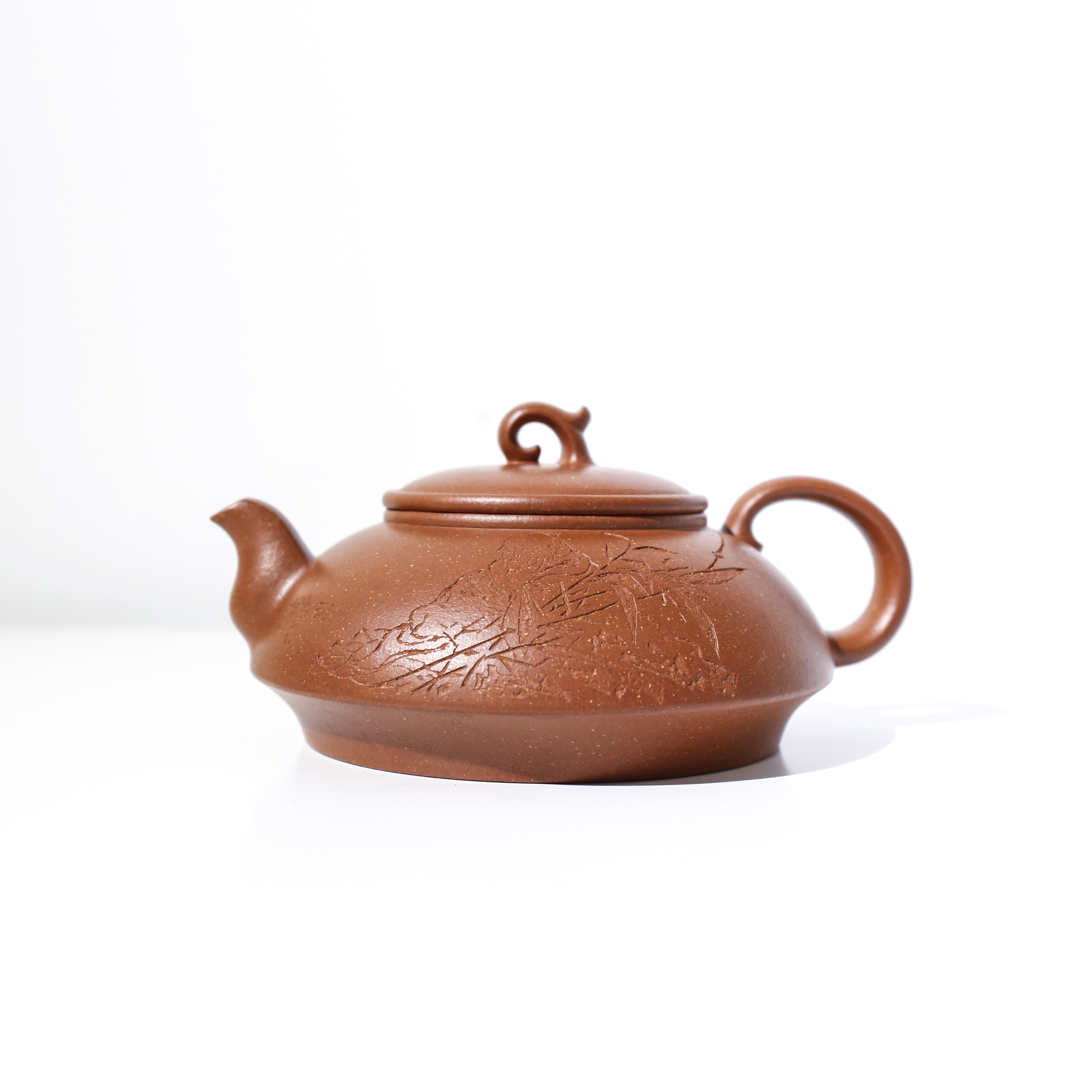 此作品選用了明清磚色泥料,并融入明清時(shí)期的線條感,線條中既有弧度,又不失穩(wěn)重、大氣。壺身一面配有詠荷雅句,另一面刻有一枝若隱若