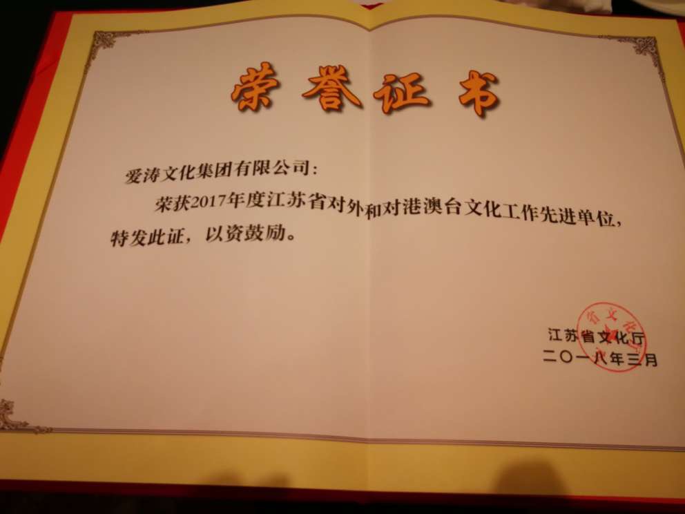 愛濤文化集團(tuán)榮獲2017年度江蘇省對(duì)外和對(duì)港澳臺(tái)文化工作先進(jìn)單位稱號(hào)